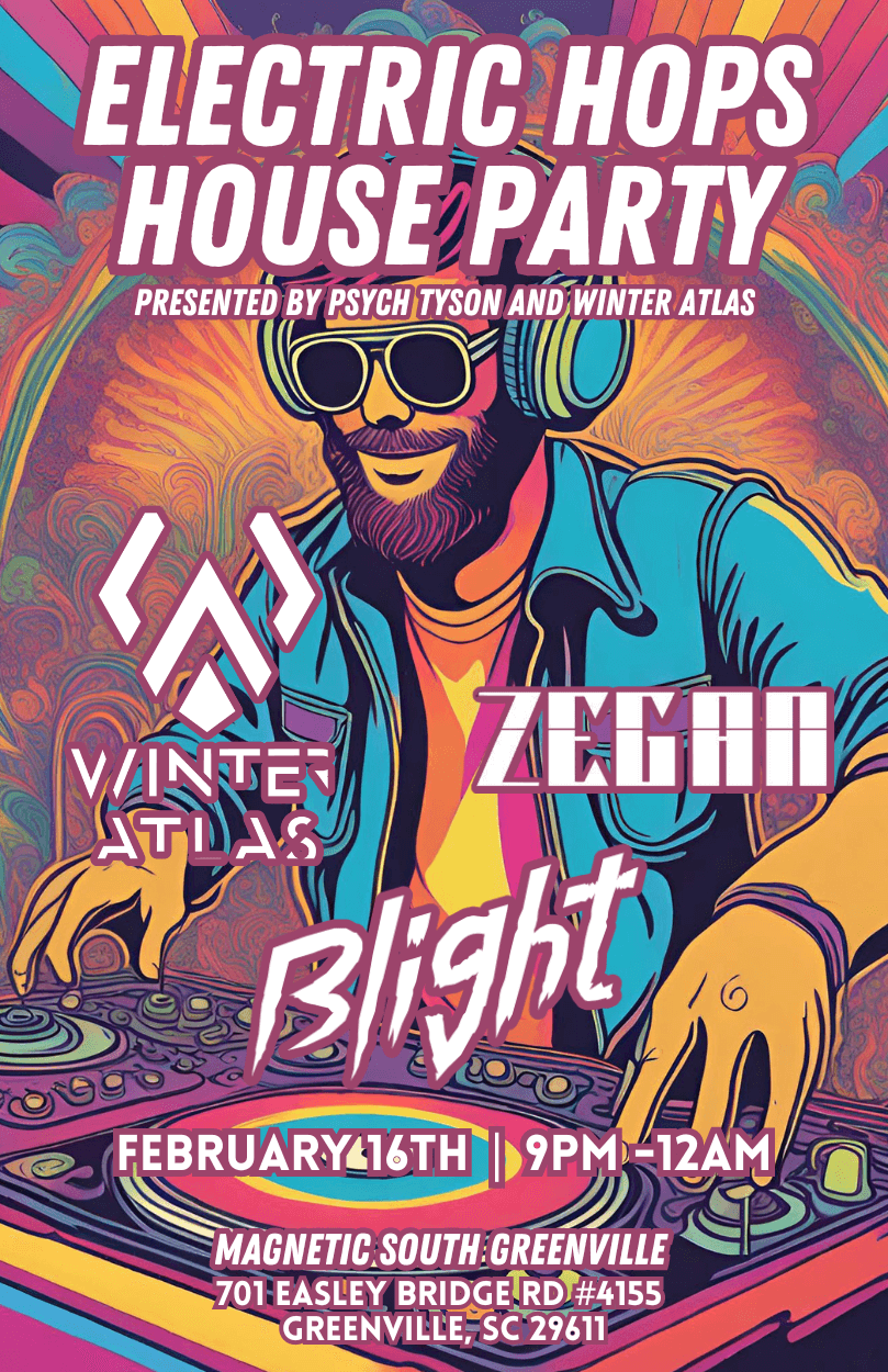 FREE EVENT! We'll have 3 different DJ's playing a set Friday February 2nd starting at 9pm until midnight! Come catch a set by Zegan, Winter Atlas and Psych Tyson! This will be held at our Greenville location! |